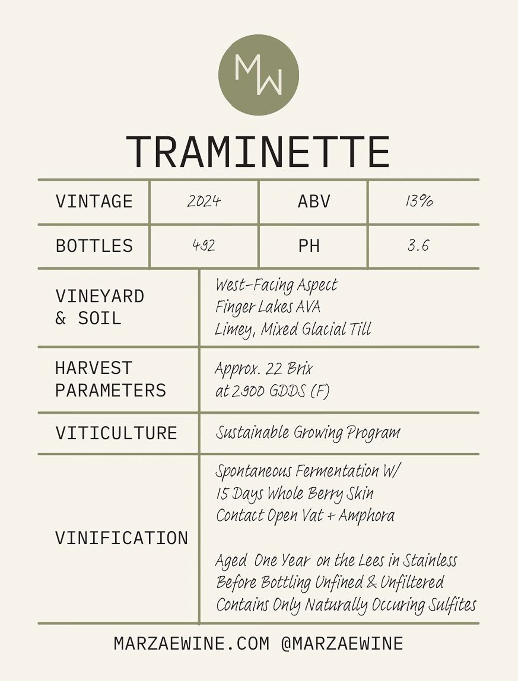Traminette is a Gewürztraminer hybrid that produces very similar wines, with slightly enhanced aromatics that give it very pronounced varietal characteristics. Skin contact is a great way to showcase many of those punchy lychee-like aromatics, and we opted for a reductive aging process on the lees to help accentuate minerality and spice to balance out the floral, fruity elements.